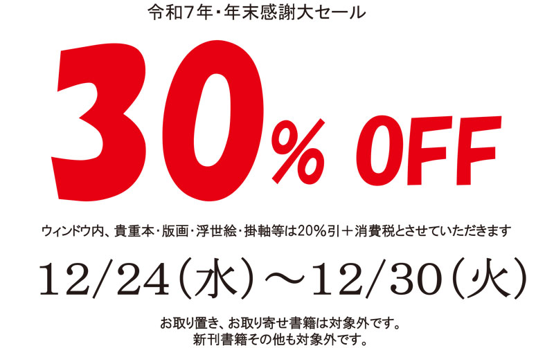 2025.12.23 / お知らせ 年末30%引きセールのお知らせ。12/24-30 本年も年末30%引きセールを開催いたします。 (ウィンドウ内、貴重本、版画、浮世絵、掛け軸などは20%引きです) 期間は 12月24日(水)~30日(火) です。 どうぞよろしくお願いいたします。